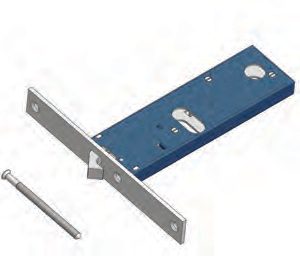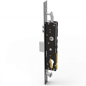 Serratura per montante con 3 punti di chiusura, catenaccio e scrocco regolabile.